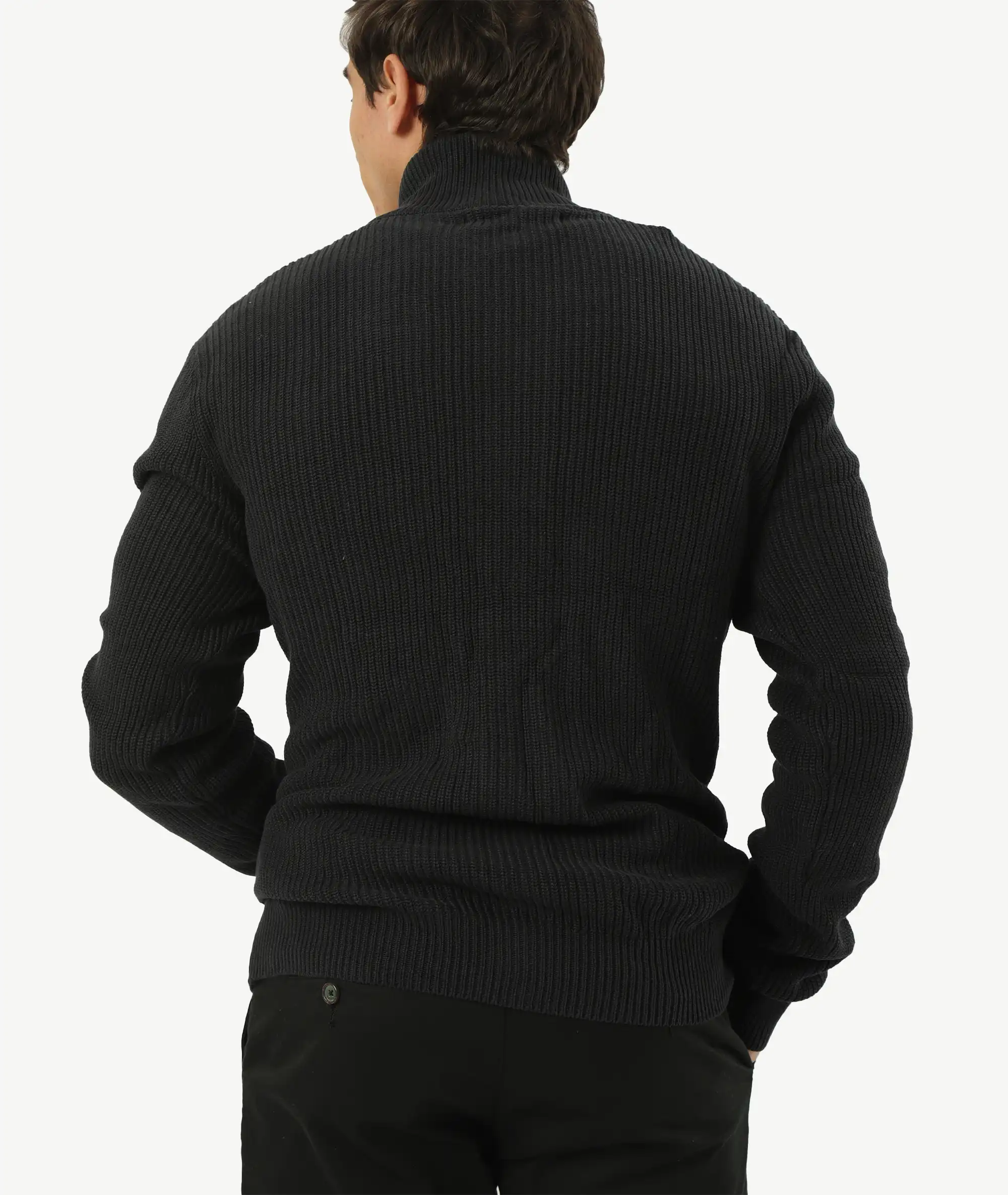 Affrontez le froid avec style grâce à ce cardigan noir en laine épaisse. Son col montant protège du vent, tandis que son boutonnage intégral permet de le porter ouvert ou fermé selon vos envies. Il est doté de poches latérales pratiques pour garder vos mains au chaud. À porter avec un t-shirt basique ou une chemise pour une allure élégante et décontractée. Un essentiel pour un vestiaire hivernal raffiné.