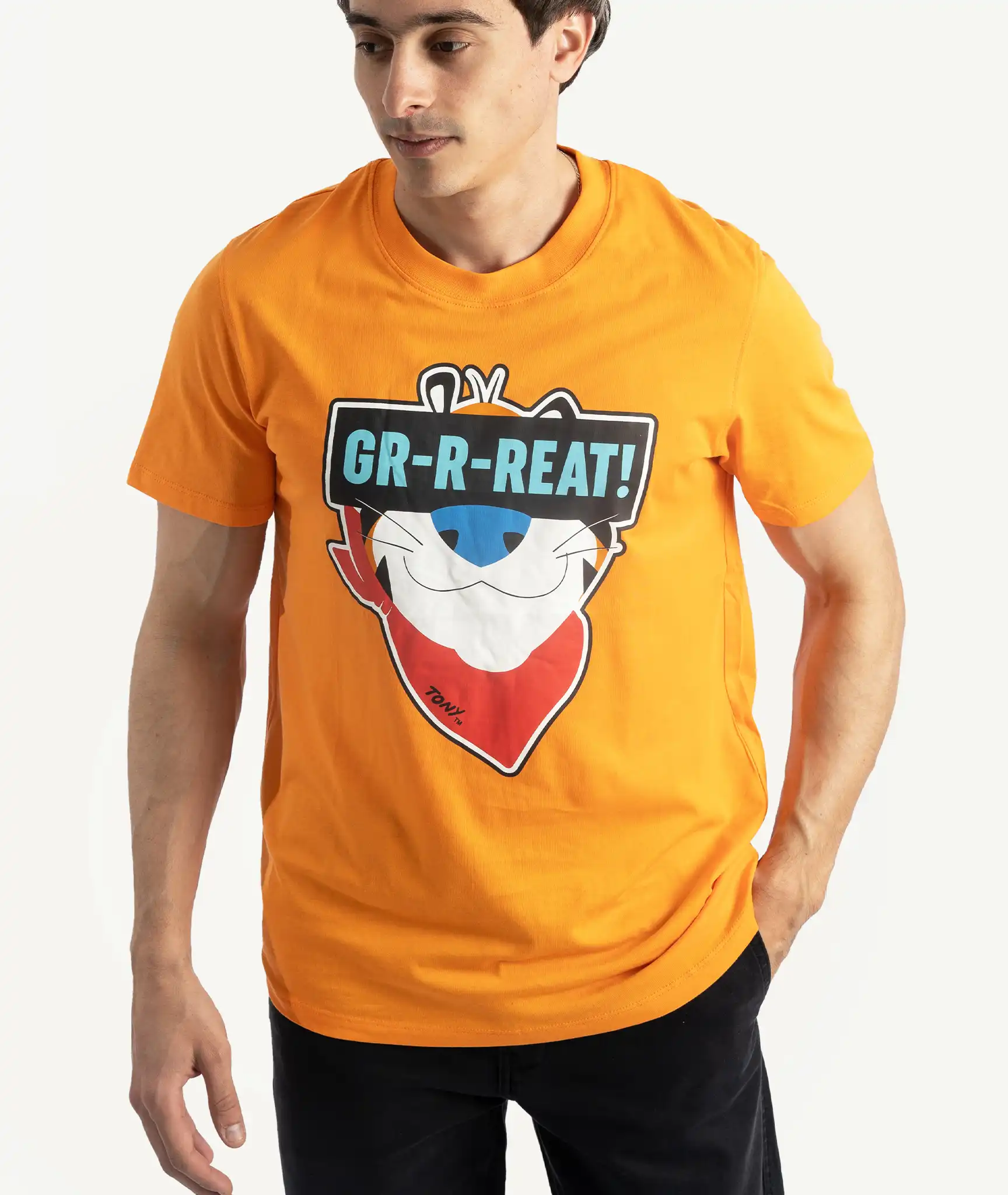Affirmez votre style avec ce t-shirt orange vif, inspiré de la pop culture et issu de la collection exclusive Normal Drop Sonic & Tony le Tigre chez Celio. Son imprimé audacieux met en avant Tony le Tigre, célèbre mascotte, accompagné de son emblématique slogan “GR-R-REAT!” pour une touche fun et rétro.